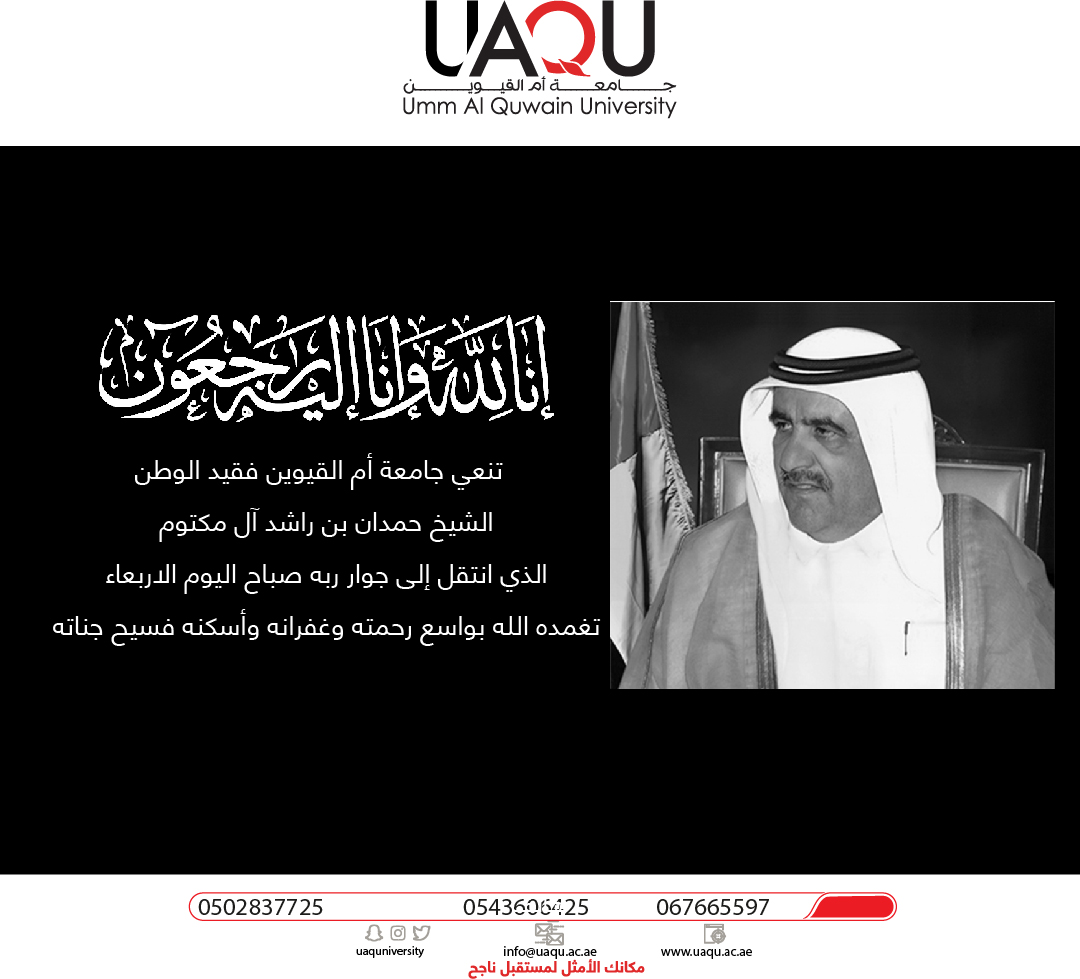 تتقدم أسرة الكلية الإماراتية الكندية الجامعية بأسمى آيات التهاني والتبريكات إلى مقام صاحب السمو الشيخ خليفة بن زايد آل نهيان رئيس الدولة "ح...