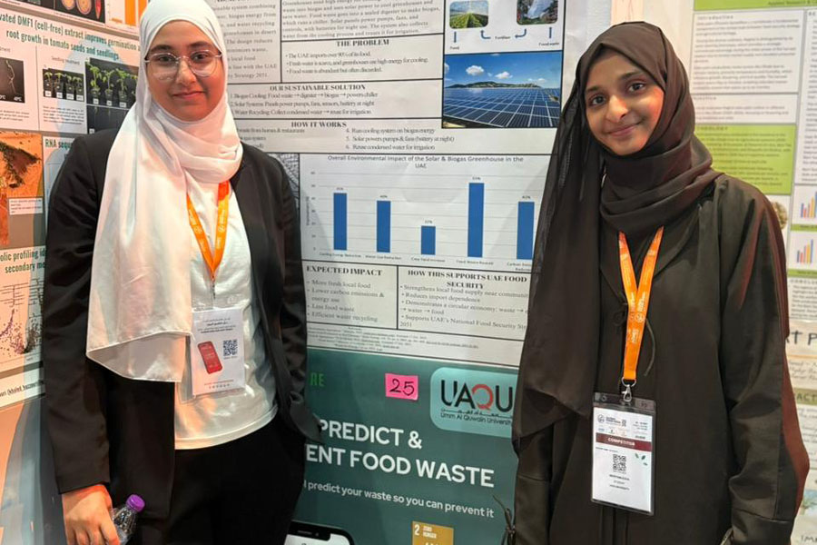 شارك فريق جامعة أم القيوين في النسخة الثانية للمسابقة الوطنية لتحدي الجامعات للأمن الغذائي والاستدامة. التي أقامتها الجامعة العربية المتحدة في الفترة من 22 وحتى 23 أكتوبر 2025 وذلك ضمن فعاليات الأسبوع العالمي للغذاء الذي تميز في أرض المعارض في العاصمة أبوظبي.  وتمت المشاركة تحت مظلة مركز إنشاء وريادة الأعمال ودعم إدارة الخدمات الجامعية وشؤون الخريجين في جامعة أم القيوين.  حيث قدمت الطالبتين "يارا عبدالغني" و الطالبة "مريم زها" حلاً مبتكراً. لقطاع المطاعم والمقاهي  " Sustaian  AE"، وذلك  باستخدام تقنيات صناعية مبتكرة لاستهلاك المواد الغذائية، وبالتالي احتياجات ذكية مطلوبة منها كمية قليلة من الغذاء مما يتيح إمكانية  اختيار المشروعي من بين أفضل 85 مشروعًا من أصل 150 مشروعًا  على مستوى الجامعة  وتمت المشاركة من مكتب المدير التنفيذي د. سوزان شاهين (مدير مركز الأعمال وريادة الأعمال) بالتنسيق مع أ الخريجين ).  التامينات لطالبات جامعة أم القيوين، ولديها المزيد من المشاركات المتميزة.