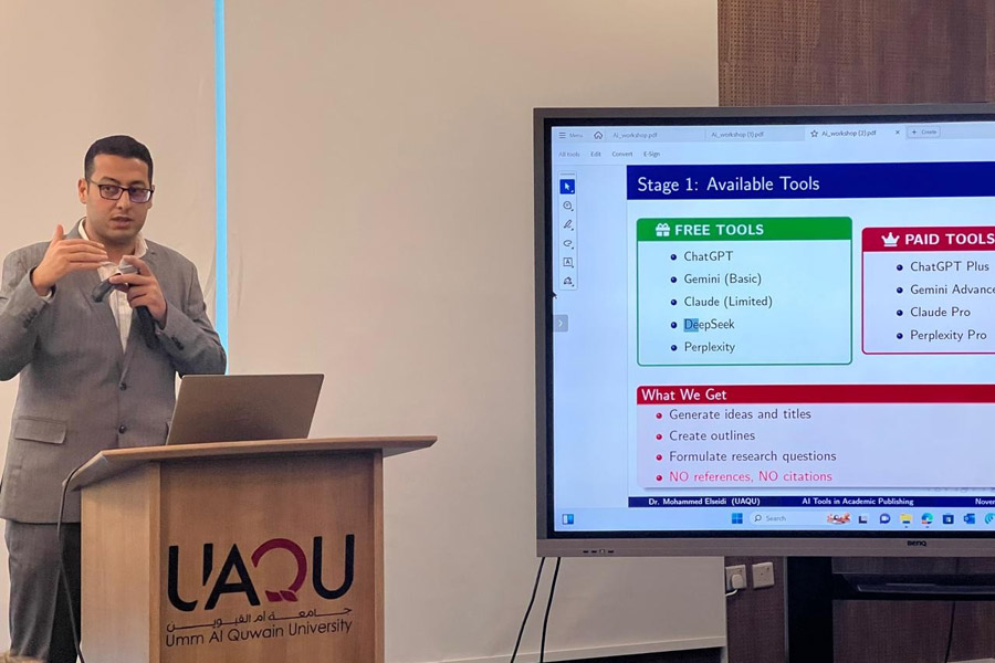 The College of Arts and Sciences at Umm Al Quwain University organized a workshop titled “Using Artificial Intelligence Tools in Academic Publishing”, delivered by Dr. Mohamed Al-Saidi, Assistant Professor of Statistics and Data Science, with the attendance of faculty members and researchers.