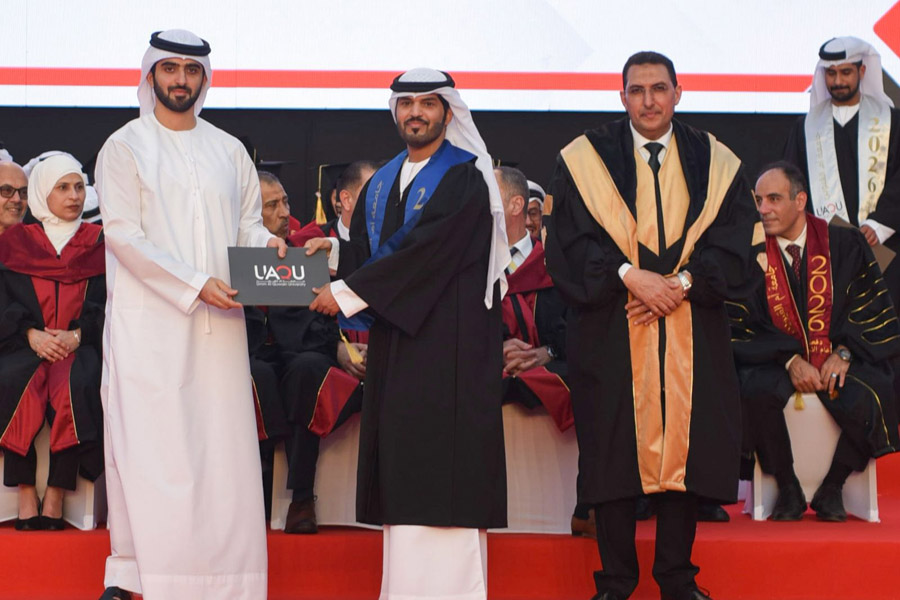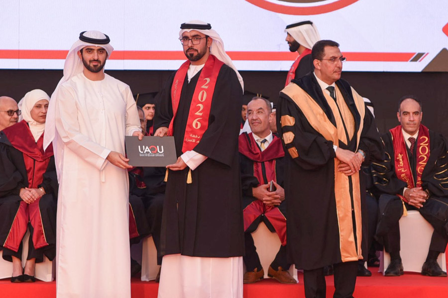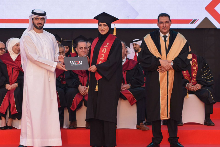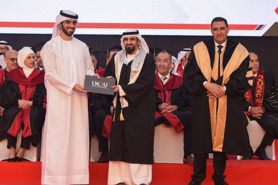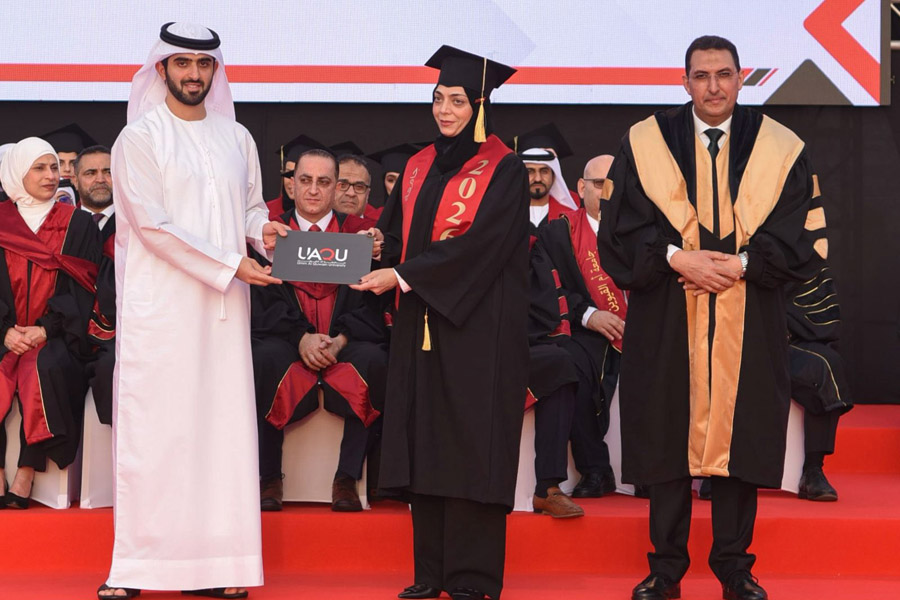 Sheikh Abdullah bin Saud Al Mualla extended his congratulations to the graduates and their families on this blessed achievement, which crowns years of academic effort and scholarly pursuit in striving for excellence and distinction, and marks the beginning of their journey into various fields of work and service. He also praised the efforts of the University’s Board of Trustees, administration, and academic staff for their dedication and sincerity, and for the remarkable achievements and esteemed academic standing the University has attained in a short period of time.