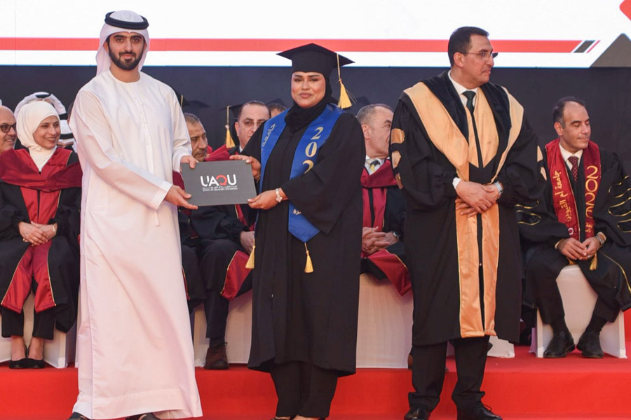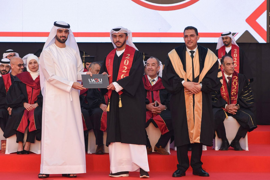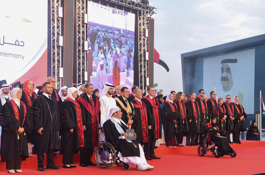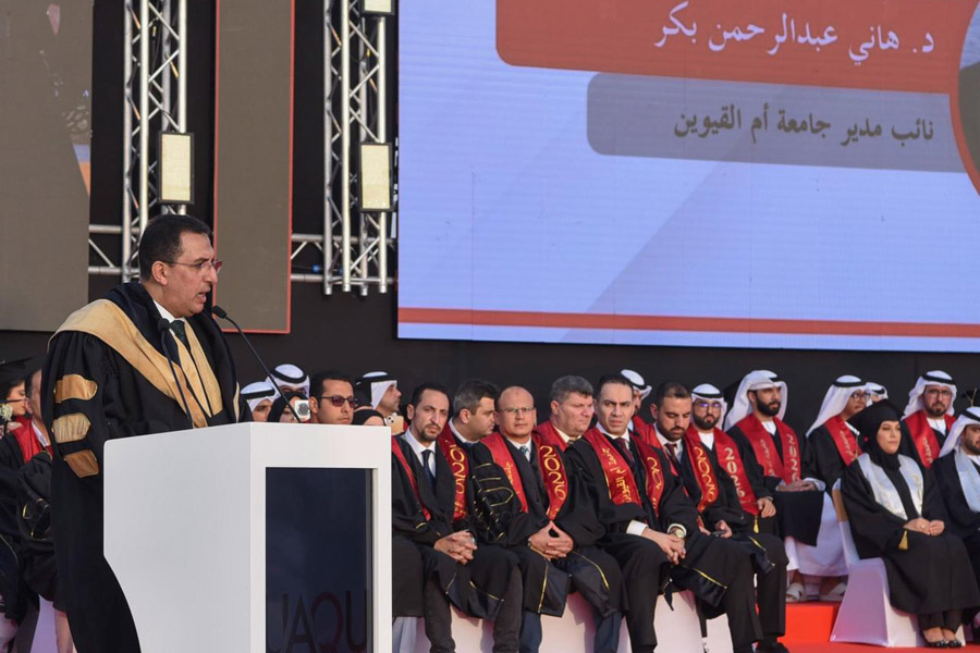 The graduation ceremony commenced with the arrival of Sheikh Abdullah bin Saud Al Mualla and the playing of the UAE national anthem. He was received by Dr. Hani Bakr, Vice Chancellor of the University, along with members of the academic and administrative staff and a number of officials.