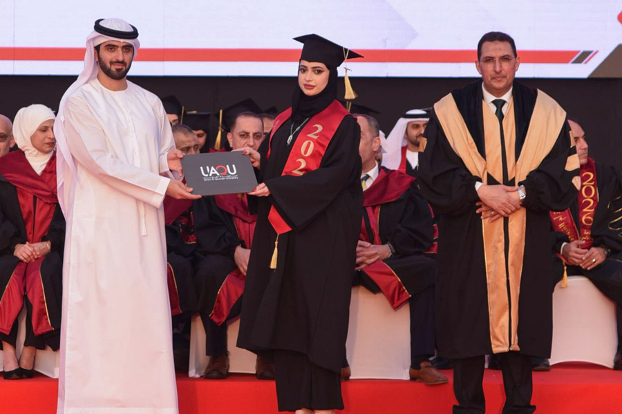 Under the patronage of His Highness Sheikh Saud bin Rashid Al Mualla, Member of the Supreme Council and Ruler of Umm Al Quwain, Sheikh Abdullah bin Saud bin Rashid Al Mualla, Chairman of the Department of Finance and Vice Chairman of the Board of Trustees of Umm Al Quwain University, attended the graduation ceremony of Umm Al Quwain University students, the “Year of the Family” cohort, which was held on the evening of the day before yesterday at the university campus.