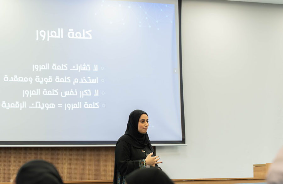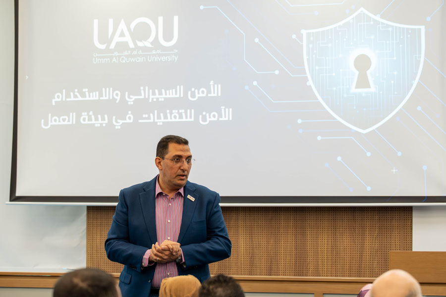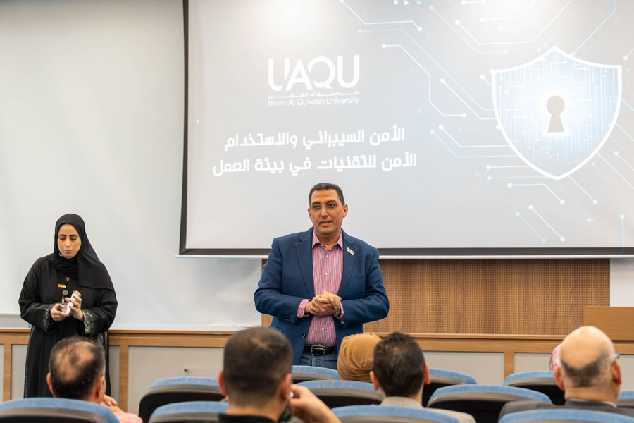 The Information Technology Department at Umm Al Quwain University organized an awareness workshop titled “Cybersecurity and the Safe Use of Technology in the Workplace”, delivered by Ms. Maryam Al Raei, with the aim of enhancing employees’ security awareness and increasing their knowledge of methods for protecting systems and digital data.
