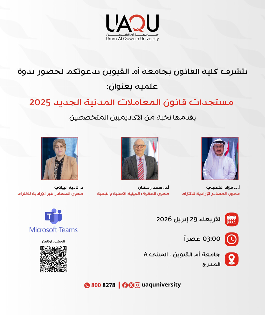 The College of Law at Umm Al Quwain University is pleased to invite you to attend a scientific seminar titled: “Recent Developments in the New Civil Transactions Law 2025”.