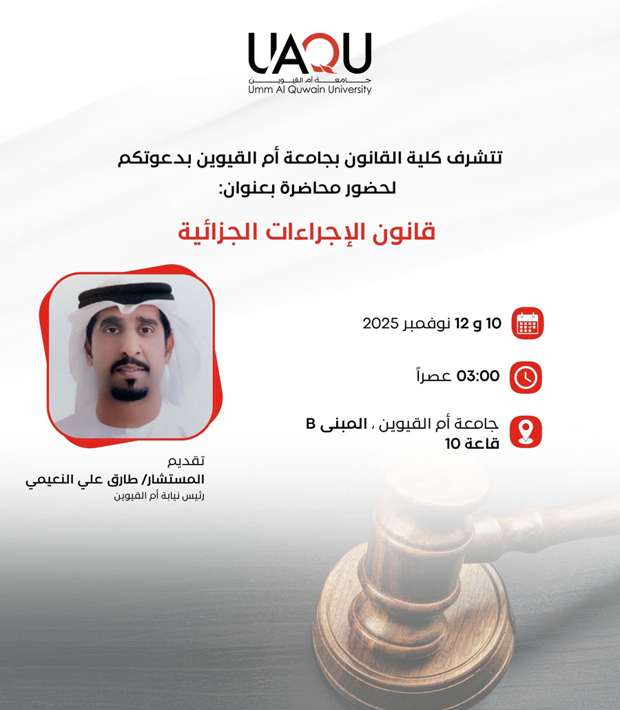 تتشرف كلية القانون بجامعة أم القيوين بدعوتكم لحضور محاضرة بعنوان: قانون الإجراءات الجزائية. 11/12/2025 - 11/12/2025 × ❮❯ Back to Main